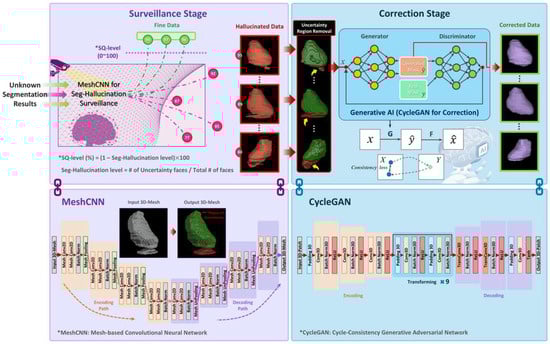 A schematic overview of the ASHSC algorithm pipeline, comprising a MeshCNN-based surveillance stage to detect and quantify the Seg-Hallucination, followed by a correction stage that employs an on-demand generative AI model (CycleGAN) to refine the uncertainty regions.