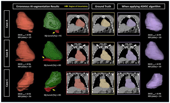 Figure 4 shows examples of the applicating the ASHSC algorithm on three representative cases with different SQ-levels. After the application of the ASHSC algorithm, in a perspective of qualitative evaluation, the uncertainty regions related to the Seg-Hallucination were dominantly removed on each erroneous result. From the perspective of quantitative evaluation, it was confirmed that the volumetric dice score and the Harsdorf distance were significantly improved compared to the case of using a single AI-based segmentation (AI-seg) model.