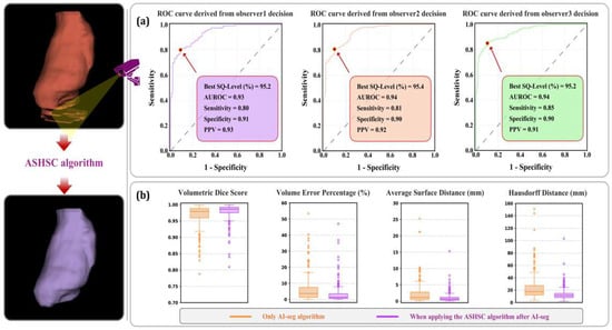 Performance of the ASHSC algorithm on the test dataset: (a) SQ-level-based surveillance performance; (b) improved performance when applying the proposed algorithm after AI-based segmentation.