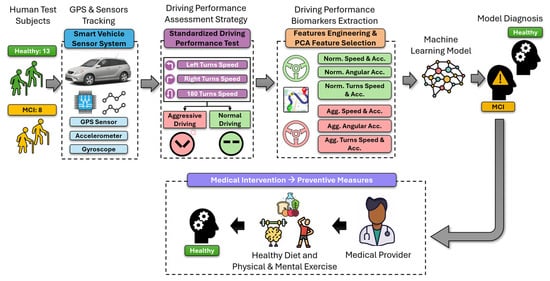 An overview of the proposed LiveDrive AI system: Once human subjects are diagnosed by a medical expert, they proceed through the system, which combines GPS and sensor tracking with a driving performance assessment strategy involving driving tests. This system analyzes the driving patterns of healthy and MCI subjects. Features such as speed and acceleration (Acc.) are extracted under normal (Norm.) and aggressive (Agg.) conditions from turning maneuvers, processed through machine-learning models for diagnosis, and linked to preventive medical interventions, including a healthy diet and physical and mental exercises.