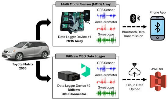 The smart vehicle sensor system setup: The test vehicle, a 2005 Toyota Matrix, was equipped with two backup data logging systems: an MMS array (Data Logger Device #1) and an OBD-connected device provided by BitBrew (Data Logger Device #2). Both loggers recorded data from three key sensors: a GPS sensor (1 Hz) for speed tracking, an accelerometer (10 Hz), and a gyroscope (10 Hz). Data from the MMS array were transmitted via Bluetooth to a smartphone within the vehicle, while the BitBrew device uploaded its readings directly to AWS S3 cloud storage.