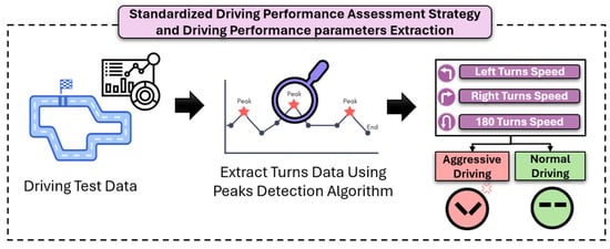 An overview of the standardized driving performance assessment strategy and driving performance parameters extraction is presented, detailing the process of generating driving data, applying a peak detection algorithm to isolate data specifically related to turning maneuvers, and extracting aggressive versus normal driving data based on instructions given to the test subjects during the standardized driving test experiment.