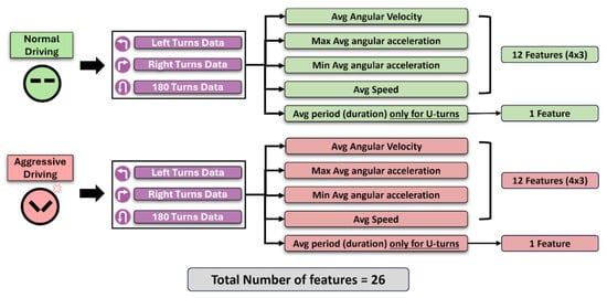 Summary of the features included in standardized tests. A total of 26 features were captured, representing the mean values of the sensor data. These features included measures of angular velocity, angular acceleration, speed during left and right turns, U-turns, and the period of U-turns. The features were categorized into normal and aggressive driving styles.