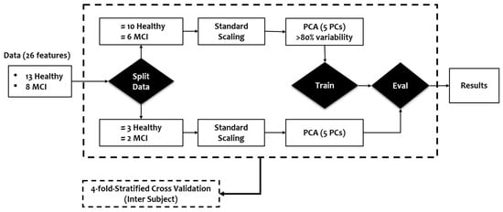 Machine learning modeling flowchart: The dataset is divided using a 4-fold inter-subject cross-validation approach, with each fold allocating around 16 subjects (10 healthy, 6 MCI) for training and 5 subjects (3 healthy, 2 MCI) for validation.