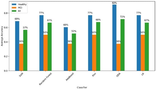 Accuracy of the ML models in diagnosing healthy and MCI subjects. Blue bars represent accuracy for identifying healthy subjects, orange bars indicate accuracy for identifying MCI subjects, and green bars show the overall accuracy across both groups (‘All’).