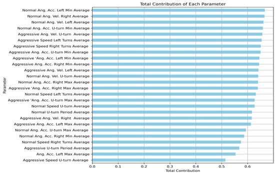 Visualization of the features contributions showcasing the most influential parameters. A higher number signifies a greater contribution to the overall model. Notably, it encompasses both normal and aggressive driving performance parameters, highlighting a comprehensive approach to understanding driving patterns.