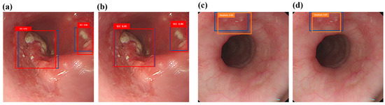 Narrow-band ECA image detection display: (a,c) are the results of narrow-band ECA image detection models SCC and dysplasia, respectively, where the blue box is the real box position, and the red and orange boxes are predicted boxes; (b,d) show the narrow-band hyperspectral ECA image detection model SCC and dysplasia category results. The blue box is the real box, and the red and orange boxes are the predicted boxes.