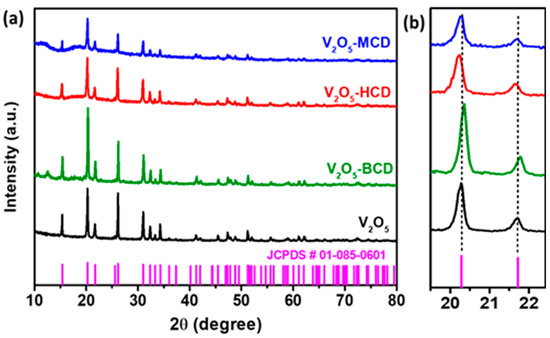 XRD patterns of as-synthesized V2O5 and V2O5 loaded with CDs (a), and expanded view of peak shifting (b).