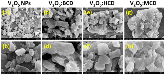 FE-SEM images of V2O5 (a,b), V2O5:BCD (c,d), V2O5:HCD (e,f), and V2O5:MCD (g,h).