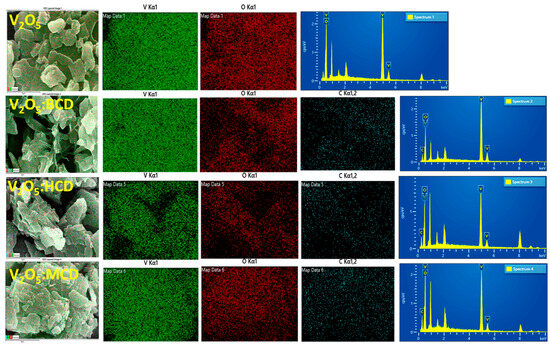 To complement the morphological analysis, elemental mapping and EDAX spectroscopy were performed to confirm the elemental composition of the samples (Figure 3). For the pristine V2O5 sample, elemental mapping revealed a uniform distribution of vanadium (V) and oxygen (O) throughout the sample, consistent with the expected stoichiometry of V2O5. The corresponding EDAX spectrum also confirmed the exclusive presence of V and O elements. In V2O5:CD, the elemental mapping indicated homogeneous distribution of vanadium, oxygen, and carbon (C), with the presence of carbon attributed to the organic CD molecules. The EDAX spectra for V2O5:BCD, V2O5:HCD, and V2O5:MCD further validated this, showing clear peaks corresponding to V, O, and C, thereby confirming successful incorporation of the cyclodextrin moieties into the V2O5 NPs.