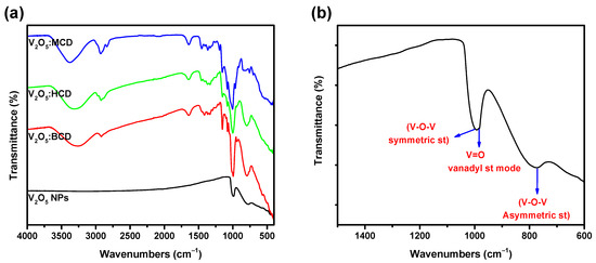 FT-IR spectra of V2O5 NPs and their BCD−loaded products (a), and expanded spectra of V2O5 NPs (b).