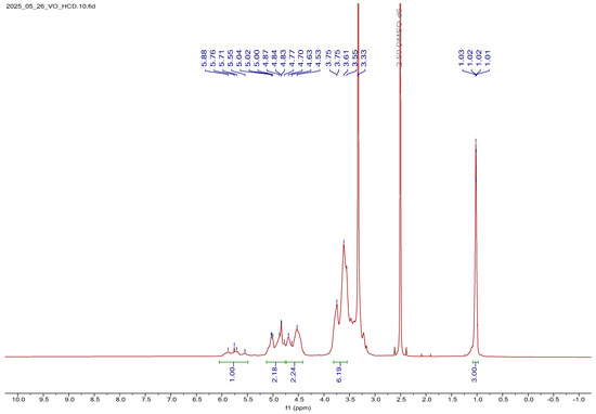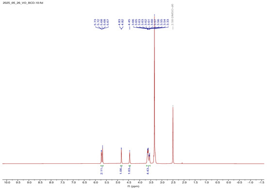 The 1H NMR spectrum of V2O5:BCD is shown in Figure 5. Upon comparison with the spectrum of free BCD, noticeable changes were observed, indicating successful interaction between the BCD host and V2O5 NPs. Specifically, the equatorial hydroxyl protons located at the C-2 and C-4 positions, along with the hydroxyl proton of the methylene group at the C-5 position, experienced a slight upfield shift of approximately 0.01 ppm. This minor shielding effect suggests weak electronic interactions or hydrogen bonding between these hydroxyl groups and the loaded V2O5 species. Additionally, the characteristic sharp proton signals seen in the spectrum of free BCD were noticeably broadened in the V2O5-loaded BCD in the form of a complex. This line broadening was attributed to the restricted molecular motion and altered local environment caused by the inclusion or surface adsorption of V2O5 within or onto the BCD matrix. The broadening effect further supports the presence of V2O5 and indicates partial complexation or physical interaction between the guest and host molecules.