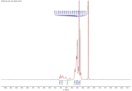 The 1H NMR spectrum of MCD is presented in Figure S3. Multiplet signals at 5.74 ppm and within the 4.72–5.03 ppm region were assigned to the axial protons of the MCD ring. Resonances corresponding to the methyl protons of methoxy substituents at the C-2 and C-3 positions, as well as the methylene protons of the glucose units, were observed at 3.56 ppm, 3.74 ppm, and within the 4.45–4.54 ppm range, respectively. A distinct singlet at 3.61 ppm was attributed to the methoxy protons of the methyl groups linked to methylene units, partially overlapping with signals from the methylene resonances. The assignment of individual proton chemical shifts was guided by the carbon environment and the nature of the substituents within the CD. A comprehensive summary of these assignments is provided in Table S3, further supporting the structural characterization of MCD [32].
