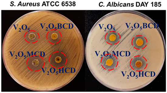 The E. coli, as a Gram-negative bacterium [ATCC 43895]; S. aureus, as a Gram-positive bacterium [ATCC 6538]; and the fungal C. albicans strain DAY185 were obtained from the Korean Culture Center of Microorganisms (KCCM, Seoul, Republic of Korea; http://www.kccm.or.kr accessed on 25 Aug 2017). Both bacterial strains were maintained and sub-cultured on sterile Mueller–Hinton agar (MHA) or Mueller–Hinton broth (MHB), and the fungal strain C. albicans DAY185 was maintained and sub-cultured on Potato Dextrose Agar (PDA) or in Potato Dextrose Broth (PDB). To check the antimicrobial efficacy of the prepared nanohybrid, as previously reported [42,43], samples were prepared by dissolving them in 100% DMSO. MHA and/or PDA plates were uniformly swabbed with 100 µL of the respective bacterial (~107 CFU/mL) or fungal (~105 CFU/mL) suspension. Agar plates were pierced with a 9 mm-diameter cork borer and loaded with 100 μL of V2O5, V2O5:BCD, V2O5:HCD, and V2O5:MCD, and then incubated for 24 h, or, in the case of C. albicans, for 48 h, at 37 °C. After incubation, the diameter of the clear inhibition zone surrounding each well was measured in millimeters using a digital Vernier caliper. The reported values represent the mean inhibition zone diameter excluding the initial 9 mm well size. Clinical Laboratory Standards Institute (CLSI) guidelines for bacteria (CLSI M100, 2015 and Clinical Laboratory Standards Institute (CLSI) guidelines for yeasts (CLSI M44, 2017) were applied. Antimicrobial analysis of each sample was conducted in duplicate, and the average of zones of inhibition were calculated and recorded. All experiments were performed using at least two independent biological cultures, with each assay conducted in triplicate.
