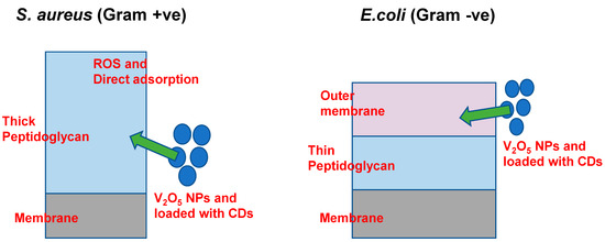 The observed antimicrobial selectivity may be attributed to fundamental differences in cell wall architecture between Gram-positive and Gram-negative bacteria. S. aureus possesses a thick but permeable peptidoglycan layer that facilitates interaction with V2O5:CD, whereas E. coli has an additional outer membrane rich in lipopolysaccharides (LPS) that acts as a strong permeability barrier, restricting nanoparticle penetration and reducing antimicrobial efficacy. Similar selective activity of nanomaterials toward Gram-positive species has been reported in earlier studies [38,39]. The detailed proposed mechanism is discussed below.