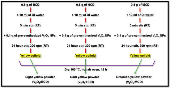 A total of 0.5 g each of BCD, HCD, and MCD was individually dissolved in 10 mL of distilled water. After stirring for 5 min, 0.1 g of the previously synthesized V2O5 was added to each solution. The mixtures were stirred at room temperature for 24 h at a constant speed of 300 rpm to ensure uniform dispersion of the V2O5 NPs within the CD solutions (Figure 10). Following the stirring period, the resulting yellow, colloidal solutions were dried at 100 °C for 12 h in a hot-air oven [28]. The final products obtained were light-yellow (V2O5:BCD), dark-yellow (V2O5:HCD), and greenish-yellow (V2O5:MCD) powders.