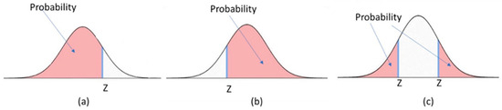 The calculation method of probabilities of the normal distribution curve with a given Z-score. (a) Probability calculated as higher values are preferable; (b) Probability calculated as lower values are preferable; and (c) Probability calculated as the value of one is ideal for variables like bilateral ratio.