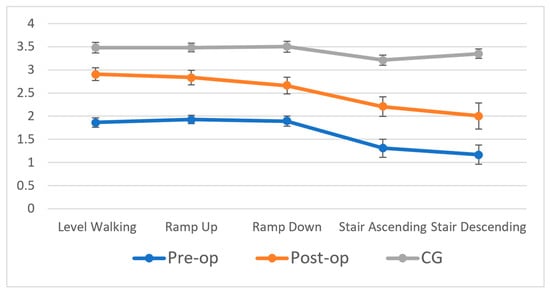 Our first hypothesis was rejected as the knee biomechanics index of stair ascending and stair descending were significantly lower than those of ramp up, ramp down, and level walking. In terms of the flexion–extension range of motion (FEROM), we found that during stair ascending and stair descending, pre-op measures were 51% and 46.7% higher compared to level walking, and 50.2% and 43.6% higher in the post-op stage, respectively. Additionally, the flexion–extension moment (FEM) in level walking was 54.2% and 63.1% lower than in stair ascending and stair descending at both pre- and post-op stages. These findings of sagittal plane knee kinematics and kinetics indicate that individuals with TKAs performing stair ambulation require greater functional capabilities. Previous studies have also reported differences between walking and stair ambulation [20,42,43,44] and between level walking and ramp walking [14,17,45,46,47]. Although no significant difference was observed in KBI between level and inclined walking, it is worth noting that the KBI is derived from six main biomechanical variables, providing a more comprehensive understanding of daily activities. Additionally, we observed a tendency for the KBI to decrease as activities transitioned from level walking to stair descending.