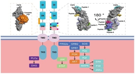 - Manfè, V.; Kochoyan, A.; Bock, E.; Berezin, V. Peptides Derived from Specific Interaction Sites of the Fibroblast Growth Factor 2—FGF Receptor Complexes Induce Receptor Activation and Signaling. J. Neurochem. 2010, 114, 74–86. [Google Scholar] [CrossRef] [PubMed]