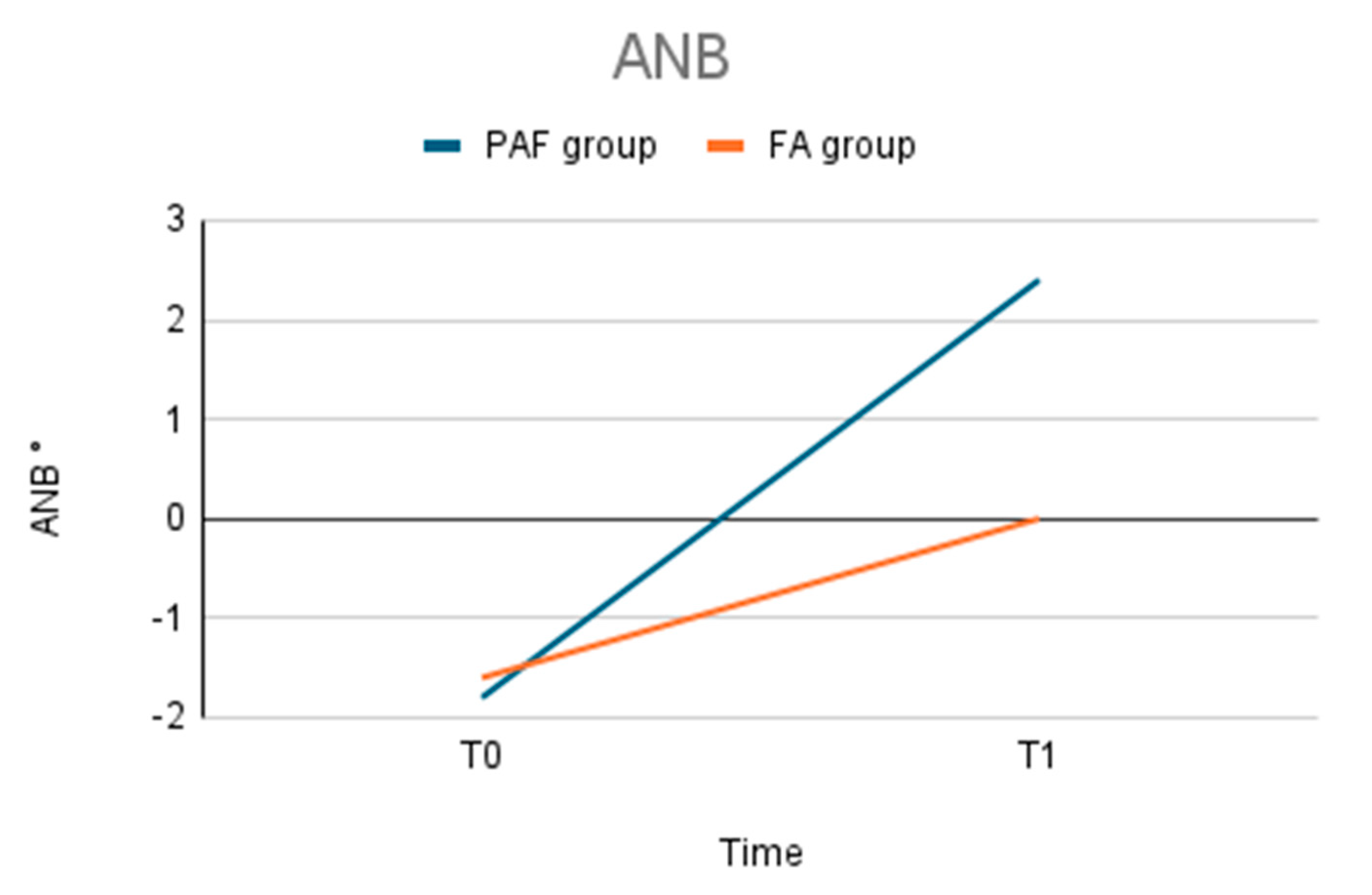 ANB (°) | −1.8 ± 0.3 | 2.4 ± 0.4 | −1.6 ± 0.4 | 0 ± 0.3 |