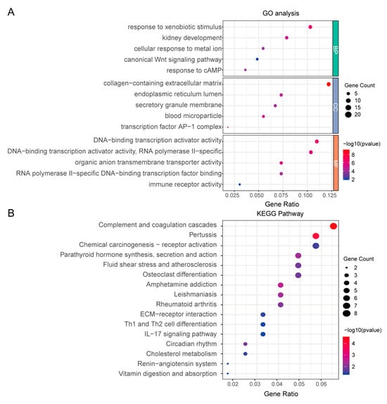 Enrichment analysis of DEGs. (A) GO enrichment analysis. (BP: biological process; CC: cell composition; MF: molecular function.) (B) KEGG enrichment analysis.