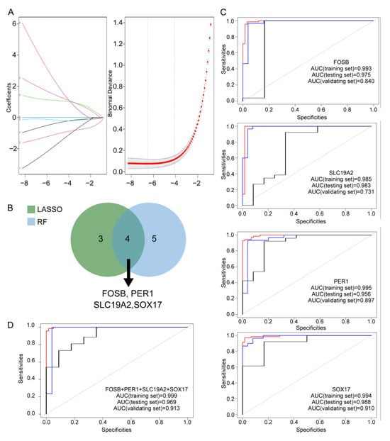 To identify hub genes associated with IgAN, we first applied weighted gene co-expression network analysis (WGCNA) to narrow down significant gene modules, followed by LASSO and RF machine learning algorithms to screen candidate genes, which can help us accelerate risk stratification and treatment matching in multiple diseases [,]. A consensus analysis of the two machine learning models revealed the four hub genes: FOSB, PER1, SLC19A2, and SOX17. Notably, FOSB has been consistently supported by previous studies [,,,,,,,,], thereby validating the robustness of our screening strategy, which integrates multiple GEO datasets to enhance biomarker discovery. ROC curve analysis further confirmed the strong diagnostic potential of these hub genes in both training and testing sets. When combined, the four genes achieved an area under the curve (AUC) of 0.999 in the training set and 0.969 in the testing set, underscoring the accuracy of our selection and their promise as potential diagnostic biomarkers and therapeutic targets.