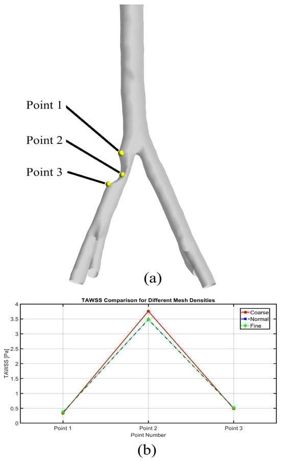 Mesh sensitivity analysis: (a): three different points to calculate time-averaged wall shear stress values; (b): time-averaged wall shear stress values in three different sets of meshes.
