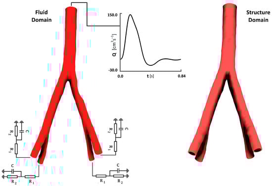For the analysis of the arterial wall, the vessel was modeled as a homogeneous, isotropic, and linear elastic material with a uniform thickness of 1.4 mm. Furthermore, the wall density was set to 1120 Kg/m3. The linear elastic model was utilized, with a Young’s modulus of 2 Mpa and a Poisson’s ratio of 0.4, as reported in the study by Skacel et al. and Camasão et al., respectively [,].
