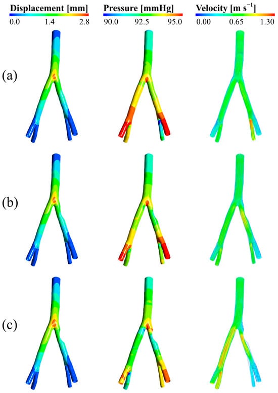 Displacement, pressure, and velocity in (a) 25 degrees of stenosis, (b) 50 degrees of stenosis, and (c) 75 degrees of stenosis.