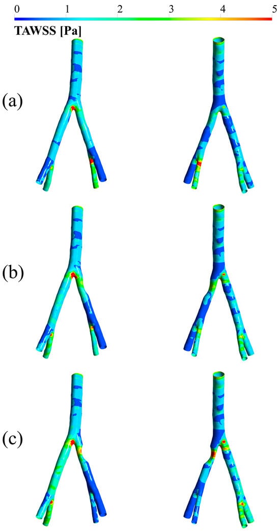 Wall shear stress (WSS) is one of the most important parameters that must be considered in cardiovascular simulations. This is because WSS has a significant impact on the structure of the inner wall of blood vessels. The mean magnitude of shear stress that is applied to the wall over time is called the TAWSS []. Low and high values of TAWSS can cause damage to the vessel wall, a topic that has been the subject of much discussion in the engineering and medical community []. Therefore, examining TAWSS in cardiovascular simulations can provide valuable and unique insights. Equation (5) represents the TAWSS. In this equation, T is the duration of the cardiac cycle, and the absolute value of wall shear stress represents the magnitude of wall shear stress.
