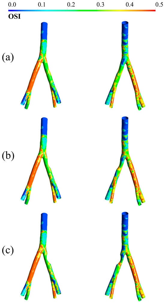 OSI in (a) 25 degrees of stenosis, (b) 50 degrees of stenosis, and (c) 75 degrees of stenosis. In each pair, the case on the left represents the anterior view and the case on the right represents the posterior view.