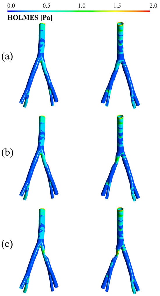 HOLMES is another index that can be considered in cardiovascular simulations []. The index presented in Equation (7) combines TAWSS OSI, providing a valuable metric for identifying regions of the vessel that may be prone to abnormal flow-related events [].