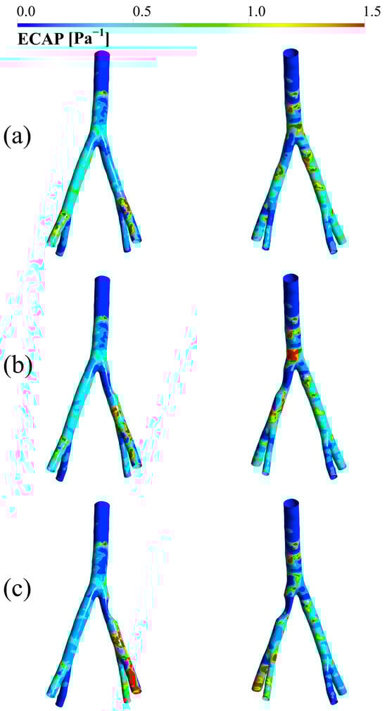 ECAP represents the level of activity of endothelial cells in response to flow []. This index, which is always in the range of 0 to 1.5 Pa−1, works in such a way that when its value is above 1.4, the probability of blood clot formation is very high []. Equation (8) represents the ECAP [,].
