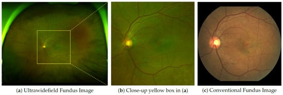 - He, S.; Ye, X.; Xie, W.; Shen, Y.; Yang, S.; Zhong, X.; Guan, H.; Zhou, X.; Wu, J.; Shen, L. Open ultrawidefield fundus image dataset with disease diagnosis and clinical image quality assessment. Sci. Data 2024, 11, 1251. [Google Scholar] [CrossRef]