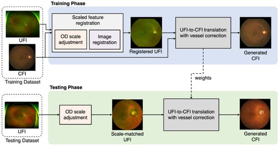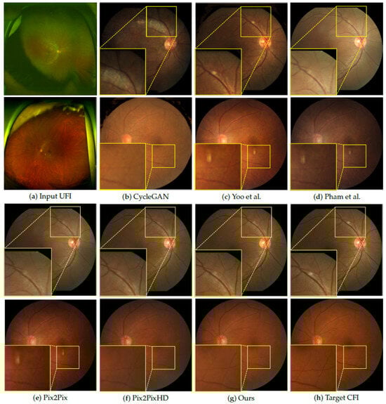 Kim, J.; Bum, J.; Le, D.-T.; Son, C.-H.; Lee, E.J.; Han, J.C.; Choo, H. Ultrawidefield-to-Conventional Fundus Image Translation with Scaled Feature Registration and Distorted Vessel Correction. Bioengineering 2025, 12, 1046. https://doi.org/10.3390/bioengineering12101046