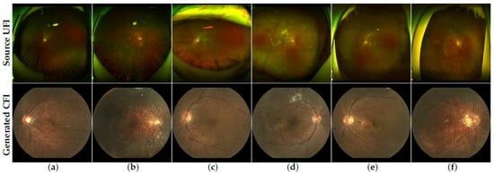 - Ge, R.; Fang, Z.; Wei, P.; Chen, Z.; Jiang, H.; Elazab, A.; Li, W.; Wan, X.; Zhang, S.; Wang, C. UWAFA-GAN: Ultra-wide-angle fluorescein angiography transformation via multi-scale generation and registration enhancement. IEEE J. Biomed. Health Inform. 2024, 28, 4820–4829. [Google Scholar] [CrossRef]