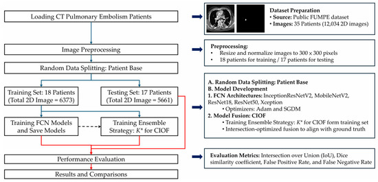 To address accurate PE detection and segmentation in CTA, we propose an AI-enhanced deep-learning framework, summarized in Figure 1. The pipeline comprises dataset preparation, patient-level splitting, preprocessing, backbone FCN training, and Consensus Intersection-Optimized Fusion (CIOF). The optimal ensemble threshold K∗ is selected on the training set by maximizing mean IoU (Algorithm 2) and is applied consistently during segmentation (Algorithm 1).