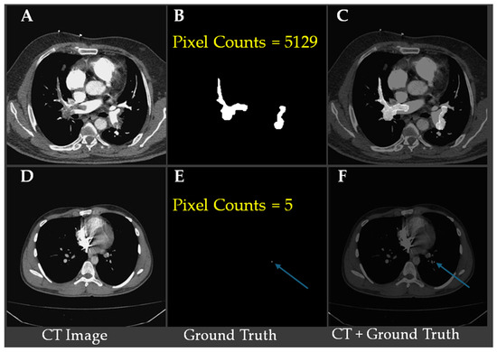 Visual comparison of the largest and smallest (blue arrows) annotated pulmonary embolism regions in CTA images. (A) CT image with a large PE region; (B) Ground-truth mask for (A); pixel count 5129; (C) Overlay of (A) and (B) (CT + ground truth); (D) CT image with a very small PE region; (E) Ground-truth mask for (D); pixel count 5 (blue arrow); (F) Overlay of (D) and (E); blue arrows indicate the tiny PE.