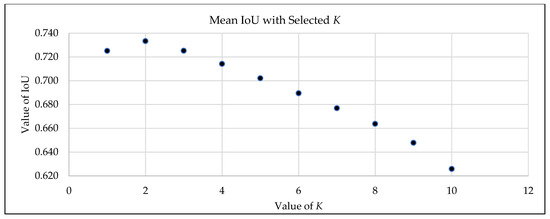 To determine the optimal consensus threshold K* for the CIOF ensemble, we trained M = 10 FCN models on the training patients and evaluated thresholds K ∈ {1, …, 10}. For each K, fused masks were created by labeling a pixel as embolus when at least K models voted positive; IoU with ground truth was computed per slice, averaged between the patients, and then averaged across the training cohort. As shown in Figure 3, the mean IoU is highest at K = 2 (≈0.74) and declines for a larger K, reflecting increasing false negatives under stricter consensus; K = 1 is more permissive and yields more false positives. We therefore fixed K* = 2 and used this unchanged value for all evaluations on the held-out test patients, preventing information leakage and aligning the ensemble with the consensus behavior of the individual models. The Majority Vote is applied as K > 5 in this study.