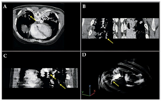Figure 4 illustrates a pulmonary embolism (PE) detected in a patient’s CT angiography, shown across axial, coronal, sagittal, and 3D views. Yellow arrows highlight the embolus location within the pulmonary artery, demonstrating the value of multi-planar visualization in accurately assessing PE size and position.