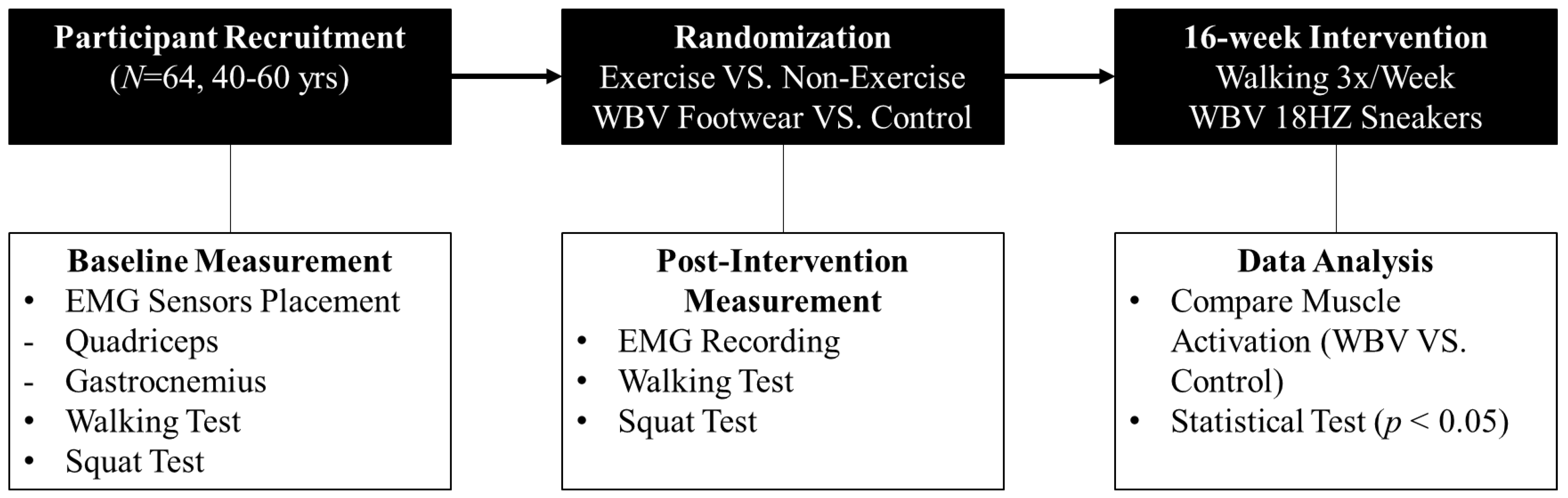 Moreover, some manufacturers have claimed that WBV training at 25 Hz can generate muscle activation equivalent to walking 10,000 steps within just seven minutes. However, such claims remain largely unsupported by empirical evidence and are often employed as marketing strategies, contributing to consumer confusion. This underscores the need for rigorous scientific evaluation of wearable WBV devices. In this study, participants were divided into an exercise group (walking for 30 min, three times per week) and a non-exercise group, each further stratified into subgroups wearing or not wearing vibrating sneakers set at 18 Hz. Over a 16-week intervention, muscle activity was measured to evaluate changes in neuromuscular activation during both walking and squatting.
