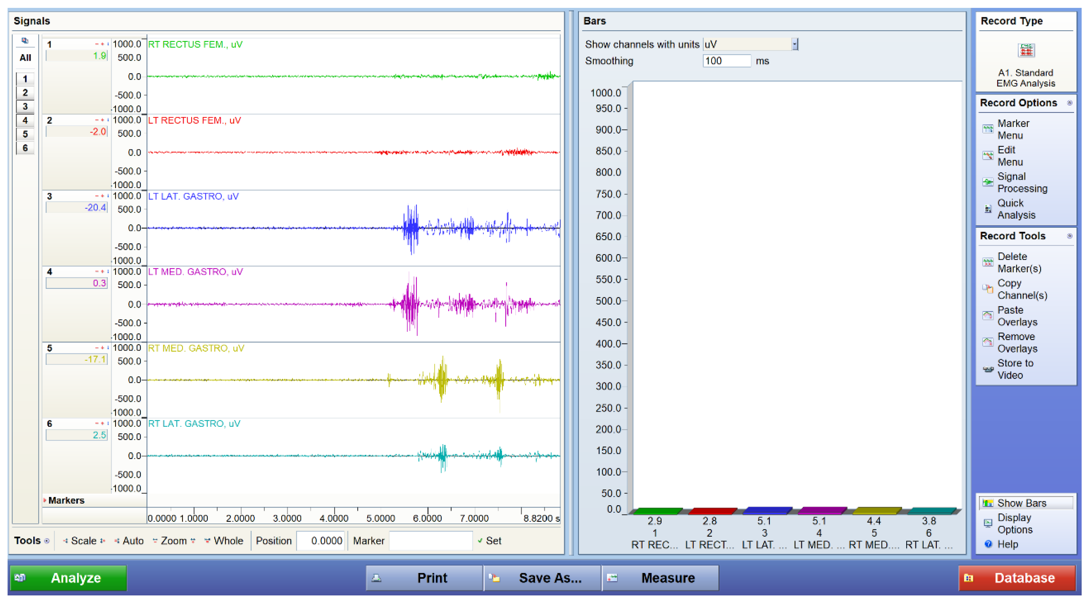 Table 4), the results were markedly different. Significant reductions in quadriceps activity were observed, with the right quadriceps decreasing from 42.76 ± 32.66 to 15.80 ± 8.17 (