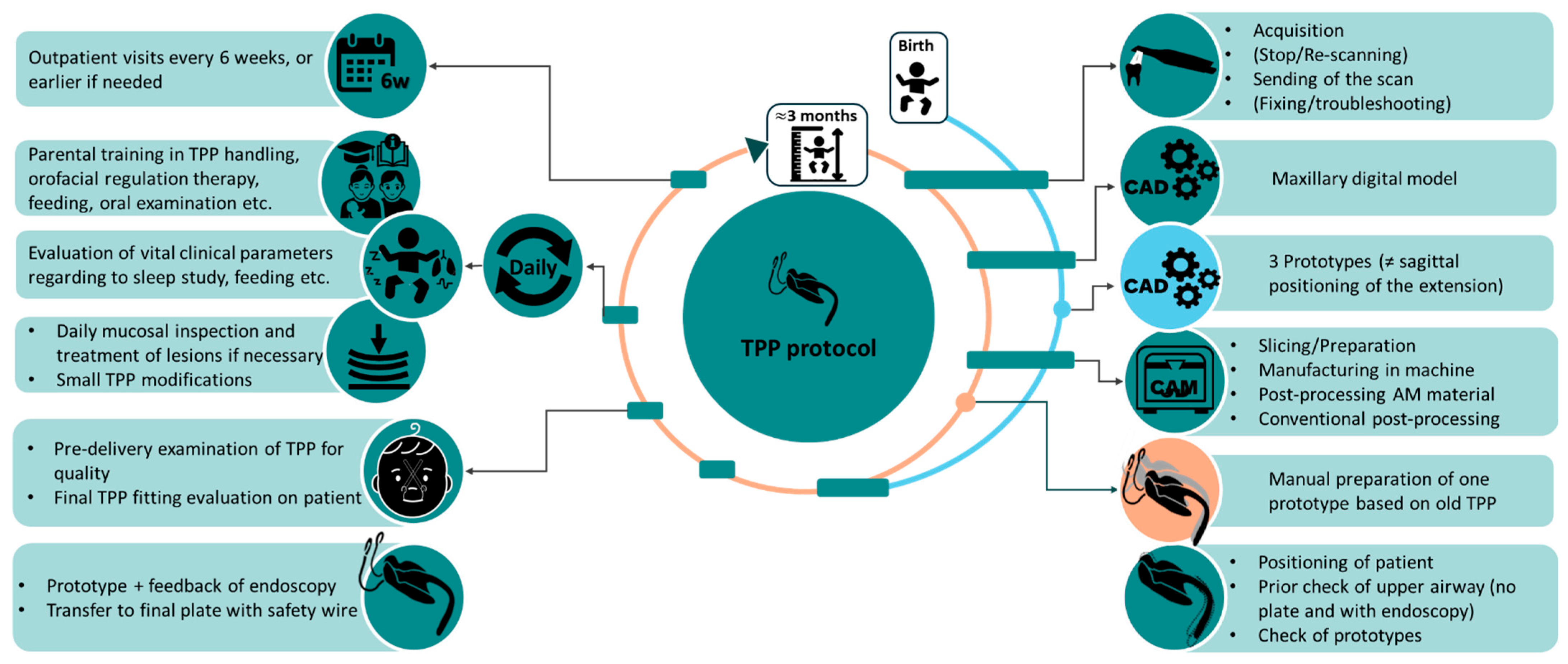 Aretxabaleta, M.; Bockstedte, M.; Heise, K.; Theis, L.; Raible, C.; Peters, K.; Wiechers, C.; Koos, B.; Poets, C.F.; Weismann, C. Complete Protocol and Guidelines for the Implementation and Manufacturing of the Tübingen Palatal Plate—An Interdisciplinary Technical Note on the Tübingen Approach for Infants with Robin Sequence. Bioengineering 2025, 12, 1063. https://doi.org/10.3390/bioengineering12101063