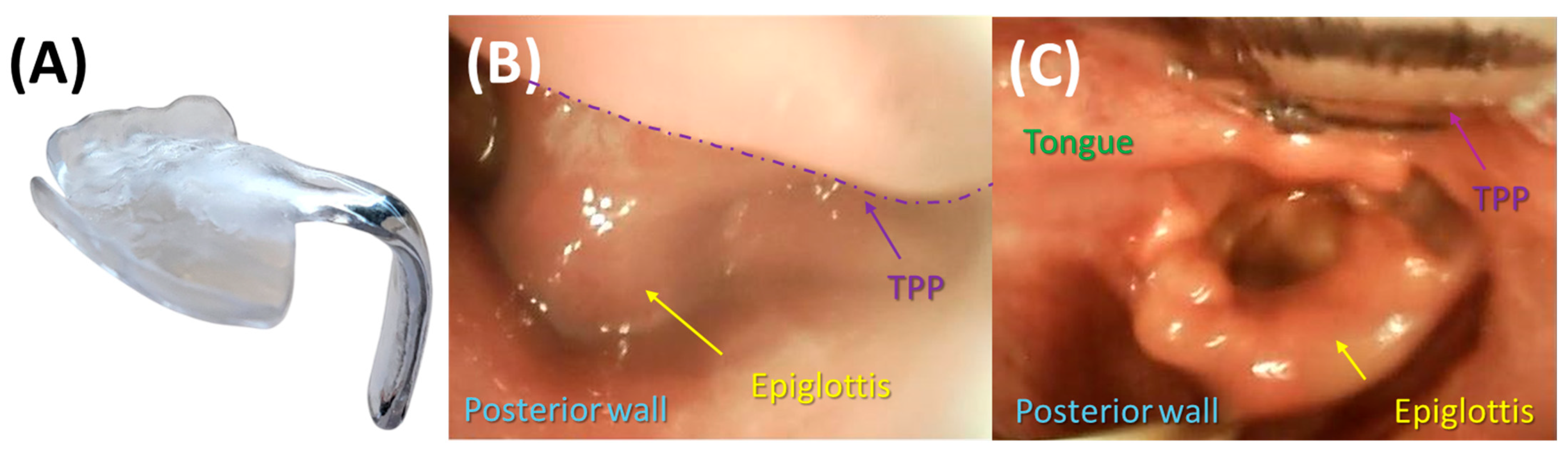 - Benitez, B.K.; Rasadurai, A.; Boccalatte, L.A.; Mueller, A.A. Pre-Epiglottic Baton Plate in Newborns with Pierre Robin Sequence: Revisiting the Practical Workflow. Laryngoscope 2024, 134, 4766. [Google Scholar] [CrossRef]