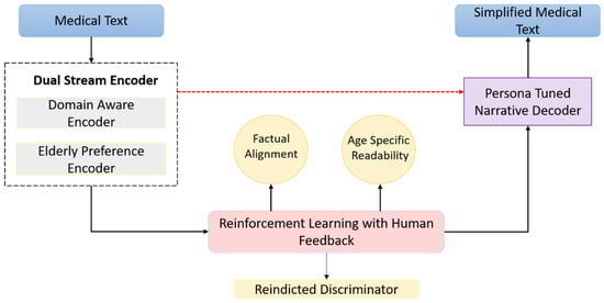 GENSIM is a modular framework designed to simplify medical text for elderly users by combining domain accuracy with age-sensitive readability. It integrates three core components: a Dual-Stream Encoder that fuses biomedical content with elder-friendly linguistic features, a Persona-Tuned Narrative Decoder that generates stylistically appropriate output, and an RLHF module that optimizes readability, faithfulness, and user alignment. Together, these components ensure that simplifications are both medically accurate and accessible to older adults. The following subsections describe each module in detail Figure 1.