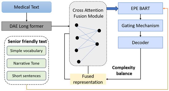 Older adults tend to exhibit distinct linguistic preferences and cognitive strategies when processing written information, often gravitating toward short, declarative sentence structures, familiar and high-frequency vocabulary, redundant phrasing for reinforcement, and a narrative or conversational tone that enhances comprehension and trust. To effectively accommodate these characteristics, the EPE is trained to internalize the stylistic and structural patterns commonly found in texts designed for senior readers. This component employs a BART-Base encoder architecture, fine-tuned on carefully curated corpora comprising NIH SeniorHealth website articles, CDC’s plain-language health resources for aging populations, and simplified content drawn from senior wellness blogs and health education newsletters. Through this training regime, the EPE learns to encode a range of simplification strategies, including the transformation of complex syntactic structures into linear, shallow clauses, the substitution of specialized medical terminology with more commonly used equivalents, and the recognition of stylistic patterns that foster comprehension, such as directive prompts and metaphorical explanations. Formally, the output of EPE is denoted , with the same dimensionality as the DAE to allow effective fusion. The representations and are fused through a Cross-Attentive Fusion Module (CAFM), inspired by dual-encoder alignment in multi-modal and translation models. The fused representation defined as: