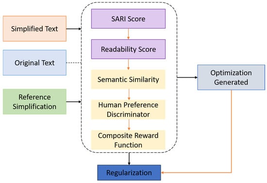 - An RLHF framework, integrating both reward-driven optimization and human-aligned preference modeling, aligns generated outputs with readability standards, while maintaining semantic fidelity through BERT-based similarity and discourse-aware discriminators.
