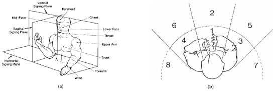 Different views of signing space. (a) The signing space and place of articulation signing parameter. (b) Areas of signing space (showing azimuth zones 1–8). (a) illustrates the place of articulation parameter. (b) shows areas of the signing space, with azimuth zones 1–8 corresponding to orientations around the signer’s body.