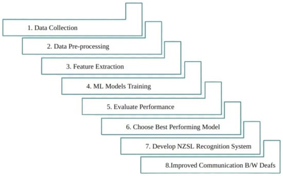 - Jayasekera, M.K.C. Real-Time New Zealand Sign Language Translator Using Convolution Neural Network. Master’s Thesis, University of Waikato, Hamilton, New Zealand, 2021. [Google Scholar]
