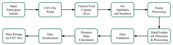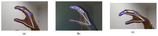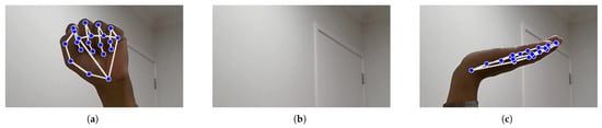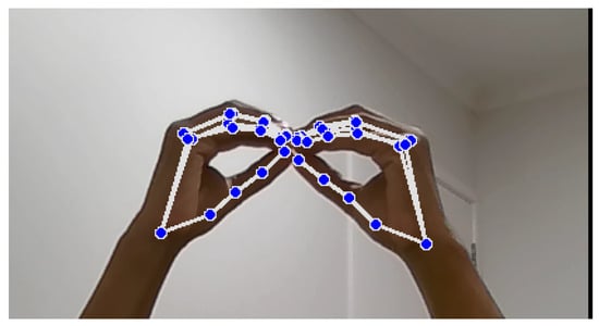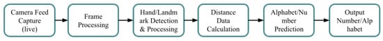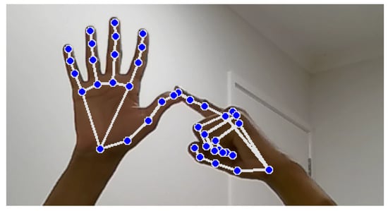 Vision-based methods record video of sign language movements using cameras. In order to identify and decipher hand shapes, gestures, and face expressions, these systems analyse visual data. OpenCV and Mediapipe are two popular technologies used to extract and process information from video frames for real-time sign language recognition [], see Figure 4. Sensor-based methods rely on wearable specialised sensors—such as wristbands or gloves—that are fitted with flex or motion sensors. These sensors take measurements of finger positions and hand movements, converting them into digital signals that the system can understand [,]. While this method can recognise gestures with great accuracy and detail, it frequently requires physical hardware. Hybrid-based strategies take advantage of the benefits of both vision-based and sensor-based techniques. These systems can improve recognition accuracy and resilience, supporting a variety of sign language motions and ambient situations, by combining visual data with sensor inputs. Hybrid systems seek to overcome the shortcomings of each distinct strategy in order to provide a more complete solution [].